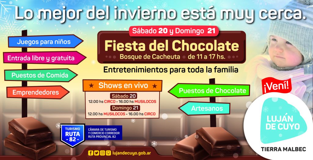 El Festival del Chocolate en los Bosques de Cacheuta forma parte de una agenda integral, elaborada y coordinada por la Subsecretaria de Cultura y Turismo del departamento, destinada a ofrecer innovadores planes en las vacaciones de invierno a los mendocinos y, fundamentalmente, a los visitantes y turistas que permanezcan en la provincia durante el receso invernal.