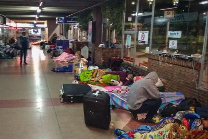 …y siguen llegando a la Terminal grupos de 10 personas, lo que se terminan concentrando cientos de ellos sin atención alguna, sin comida y durmiendo con sus hijos en el piso. Solo la Iglesia Evangélica del Borbollón les acercó desayuno.