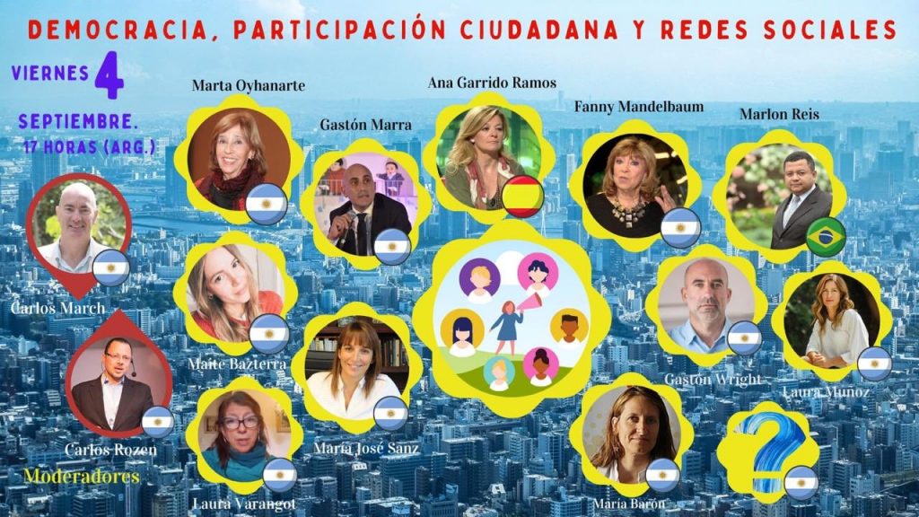 Con el objetivo de visibilizar el impacto de la participación digital de la ciudadanía en la formación de las leyes, su influencia en la ética de la política y su efecto en la calidad Institucional; el rol de los movimientos ciudadanos independientes, las organizaciones de la sociedad civil y el periodismo se realizó este viernes 4 de septiembre un trascendental encuentro virtual denominado “Democracia, Participación Ciudadana y Redes sociales”