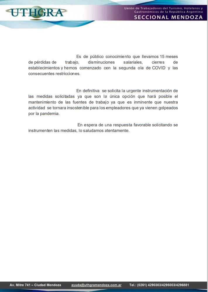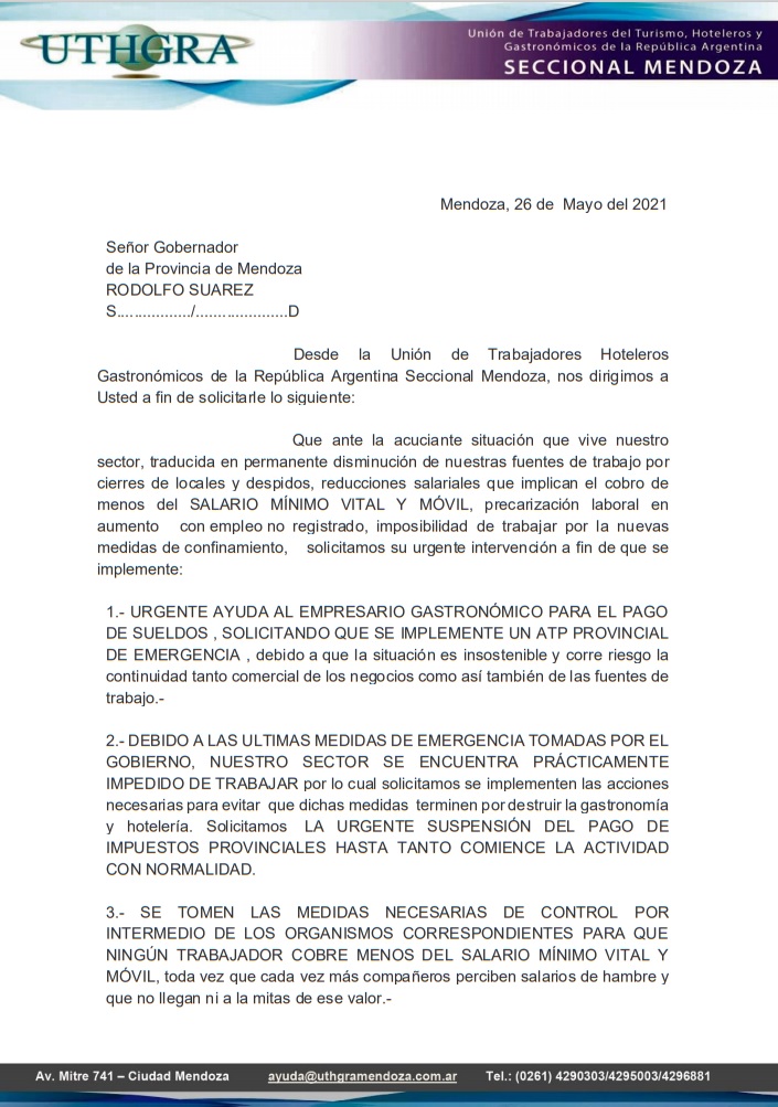 Si todos quieren una Mendoza atractiva para el turismo nacional e internacional en los próximos años, el gobierno de Rodolfo Suarez tiene que hacer un mínimo esfuerzo para ayudar hoy a los sectores productivos de la gastronomía y la hotelería. Por esa razón, desde la Unión de Trabajadores del Turismo, Hoteleros y Gastronómicos de la República Argentina Seccional Mendoza, vuelven a solicitar una ayuda efectiva para todos los trabajadores y trabajadoras del sector «La situación económica es insostenible y la pérdida de puestos de trabajo es imparable. Además requerimos imperiosamente que los empleados sean incluidos entre los grupos prioritarios para la vacunación contra el Covid-19».