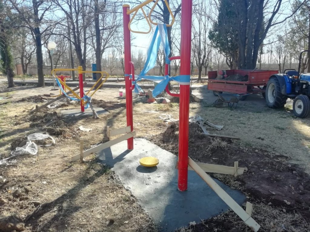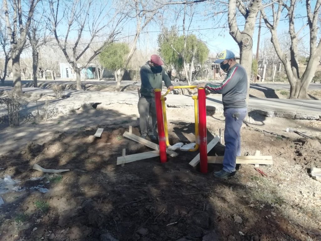 Empleados municipales colocaron esta mañana los aparatos para actividades recreativas y ejercicios físicos que podrán utilizar todos los residentes de esa zona situada a 36 km al sur de la Ciudad de San Rafael.