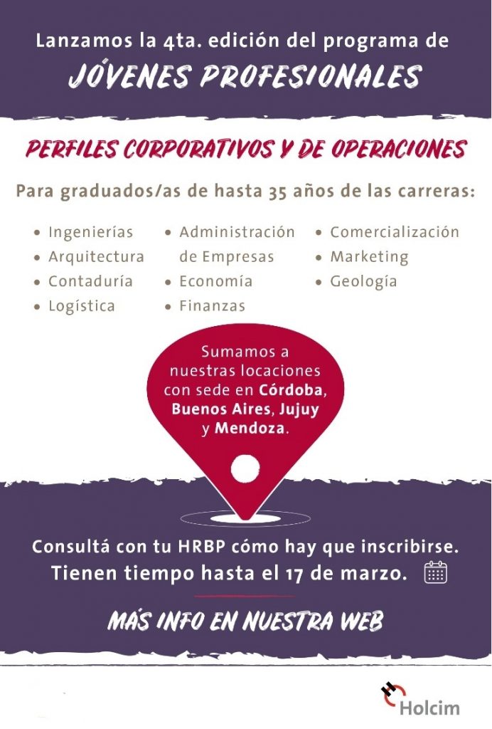 Holcim Argentina, líder en soluciones innovadoras y sostenibles para la construcción, lanzó su cuarta edición del Programa de Jóvenes Profesionales a nivel nacional. El mismo tiene como objetivo la búsqueda de nuevos talentos que iniciarán, en esta oportunidad, un proceso de desarrollo en diferentes áreas de la empresa en la provincia de Mendoza.