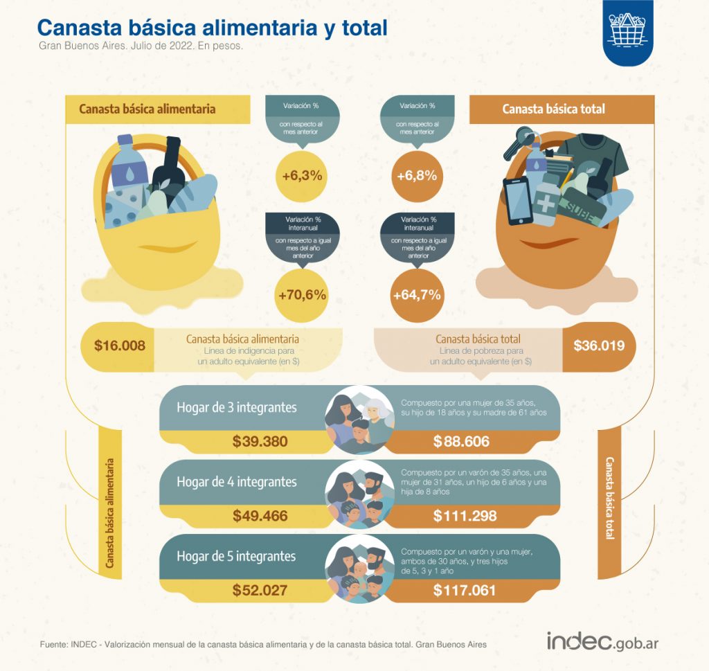El INDEC difundió que una familia de cuatro integrantes necesitó $ 111.297,57 para superar el umbral de pobreza durante julio de 2022.