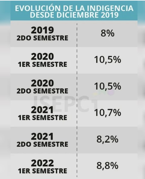 La inflación, además, sigue pegando en el punto de flotación del Gobierno, que de acuerdo a la foto de hoy no sólo no ha logrado bajar la indigencia respecto de la administración de Cambiemos, sino que incluso la incrementó: pasó de 8 puntos en el último semestre de 2019 a 8,8 en 2022.