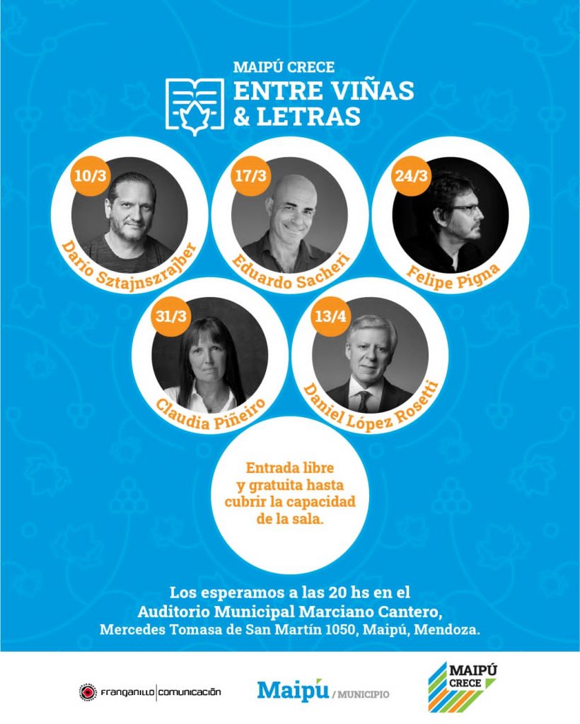 Organizado por la Municipalidad de Maipú se anuncia el inicio para el próximo 10 de marzo del ciclo de escritores “Maipú crece entre viñas y letras”, del que participarán los escritores Darío Sztajnszrajber, Eduardo Sacheri, Felipe Pigna, Claudia Piñeiro y Daniel López Rosetti.