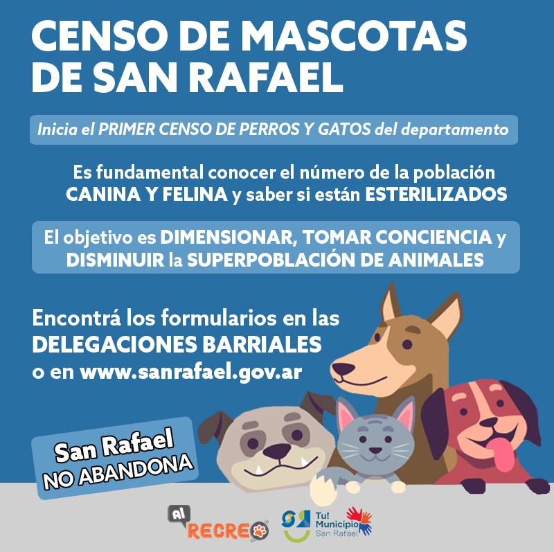 El Municipio de San Rafael a través de su área de Veterinaria y Zoonosis, conjuntamente con la agrupación promotora de esterilizaciones “Al Recreo”, realizarán el primer censo de perros y gatos para tener datos fehacientes y estadísticos sobre ambas comunidades.