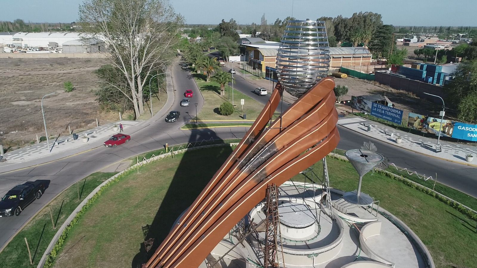La «frutilla del postre» de la inversión que realizó el Municipio en ese lugar, es una megaescultura que rinde homenaje al vino, nuestra bebida nacional. Se trata de una mano que sale de la tierra y sostiene una copa fabricada en acero inoxidable. La estructura tiene más de 15 metros de altura y apunta a ser el monumento alusivo al vino más importante de nuestra provincia.
