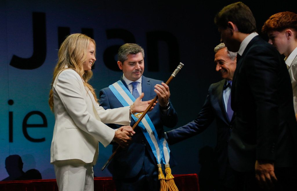 En primer término, el gobernador electo recibió la banda de manos del gobernador mandato cumplido, Sergio Uñac. Mientras que, el bastón lo recibió de parte de su esposa María Eliana Albornoz, sus hijos Delfina y Benicio, el senador mandato cumplido, Roberto Basualdo, y los hermanos, Juan José y Cecilia.