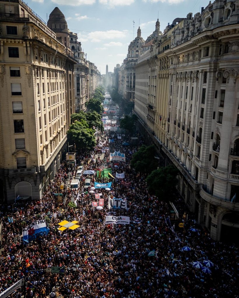 Pasando las barandas, decenas de centros de estudiantes poblaban más de una cuadra entera de esa juventud que tantas veces se le adjudica como propiedad a los libertarios. Ana y Eva son estudiantes del Mariano Acosta y tienen 17 años, la misma edad que muchos de los detenidos y desaparecidos por la última dictadura cívico militar. “Un 24 siempre es importante estar en la plaza, mucho más con un Gobierno que niega lo que fue la dictadura y usan los mismos discursos de los militares para negar el genocidio, presentándolo como una guerra y no como una desaparición sistemática de personas” dicen en las calles de la ciudad de la furia.