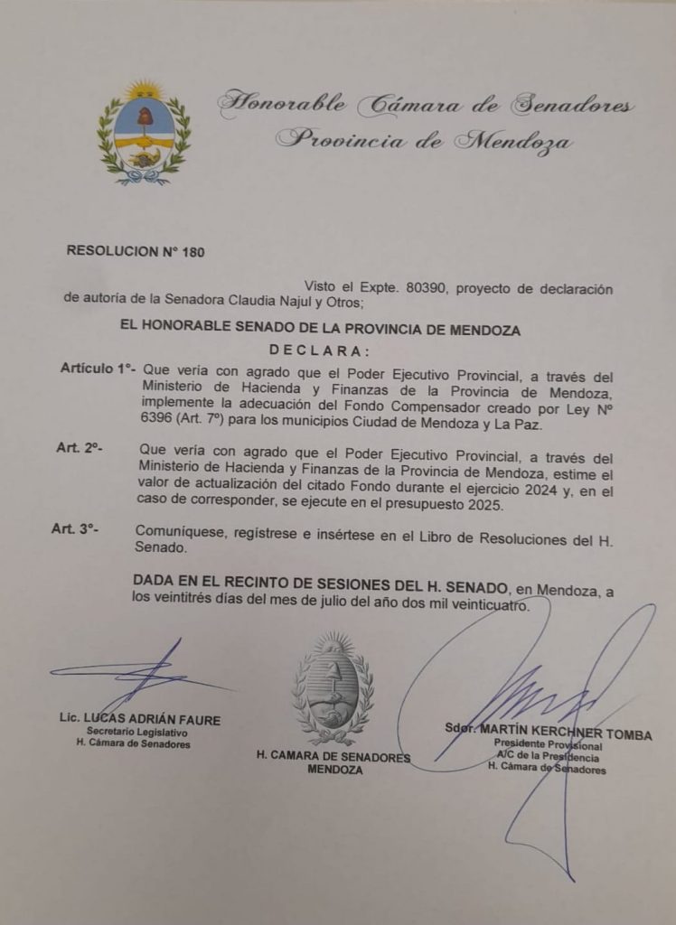 El intendente de Ciudad, Ulpiano Suarez, celebró la aprobación de la resolución 180 en el Senado, por la cual dicha cámara le pide al Gobierno que adecúe el Fondo Compensador, ítem de la coparticipación, durante este año, y que en caso de corresponder, lo ejecute en 2025, un reclamo que el jefe comunal trae desde 2022.