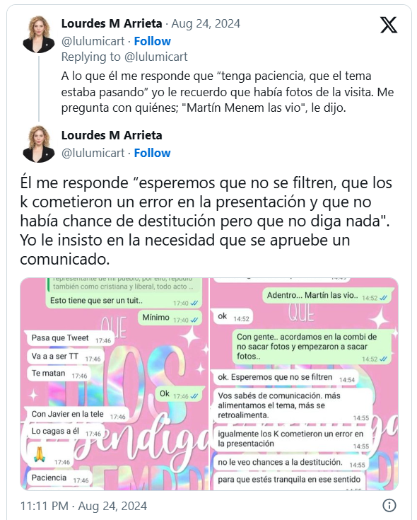 Luego, comienzan las dudas sobre las posibilidades de que desde LLA ayuden a tapar lo sucedido: «En ese chat, se puede ver el operativo ‘limpieza’ donde se pide a todos borrar las fotografías, para poder tapar al máximo lo que había sucedido y negar la visita». «Quiero agregar que siempre puse en conocimiento de mis autoridades lo que pasó. De esta manera, adjunto chat con Santiago Cossimano (vocero de Menem en el Congreso), donde le manifiesto mi necesidad de expresar y contar lo que había pasado en mis redes, a lo que él me responde que ‘tenga paciencia, que el tema estaba pasando’ yo le recuerdo que había fotos de la visita. Me pregunta con quiénes; ‘Martín Menem las vio'», destacó Arrieta.