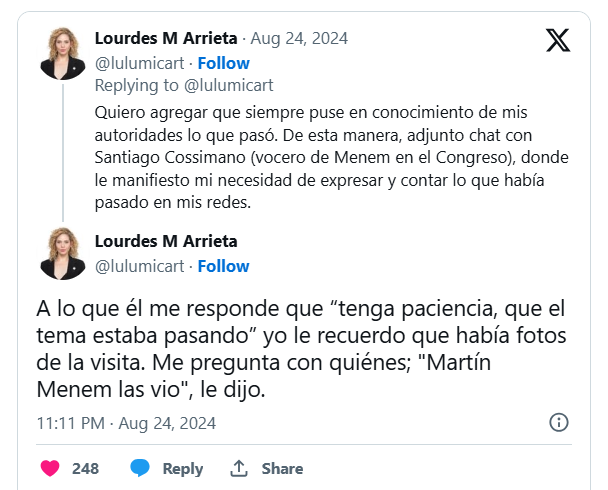 Siguieron las revelaciones: «Alida Ferreyra admite que fue a Campo de Mayo con Beltrán Benedit, en marzo y se jacta que “nadie supo». Benedit remarcó: «Acabo de hablar con Shariff (Menem, mano derecha de Martín Menem en el congreso) que me llamó e insistió en que se apruebe la publicación y cerremos el tema. Está en eso».