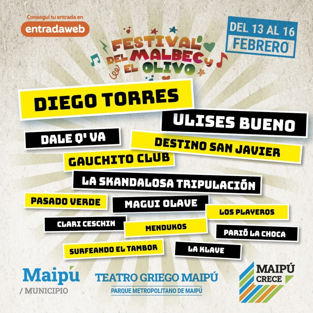 La tercera edición del Festival del Malbec y el Olivo contará con cuatro jornadas, incluida la Vendimia departamental. Diferentes artistas y grupos musicales se presentarán en el escenario del teatro griego maipucino.