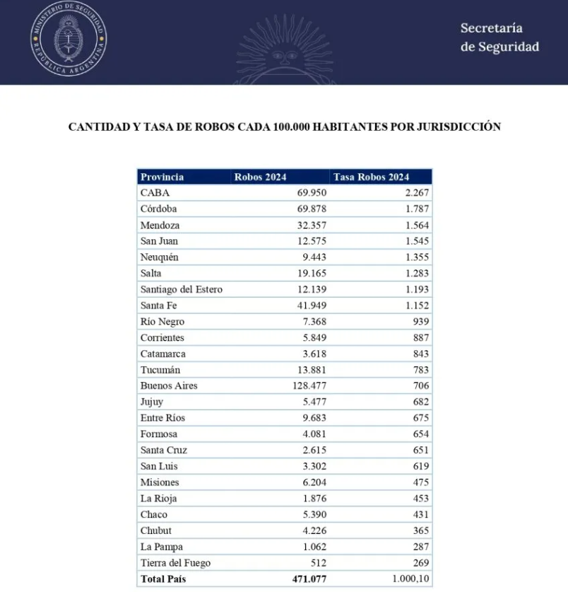 Según datos que dio a conocer este domingo el Ministerio de Seguridad de Nación, la provincia de Mendoza se encuentra entre las de mayor tasa de robos en Argentina, con 1.564 delitos cada 100.000 habitantes según los datos del 2024. Esta cifra coloca a la provincia en el tercer lugar del país, superada solo por la Ciudad Autónoma de Buenos Aires (CABA) y Córdoba.