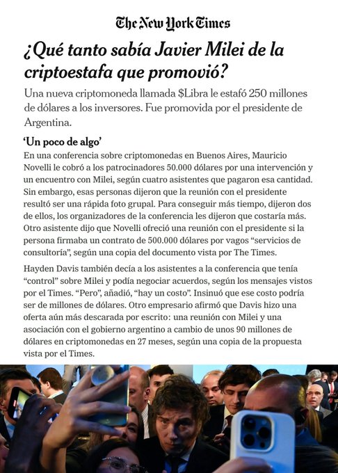 Hoy justamente el prestigioso diario The New York Times publica una extensa investigación sobre el caso $LIBRA en la que cita a empresarios del mundo cripto que revelaron pedidos de dinero para ver al presidente Javier Milei por parte del consultor Mauricio Novelli, la persona que introdujo en el círculo de poder a Hayden Mark Davis, creador del activo que derivó en el escándalo libertario del 14 de febrero pasado. Las cifras mencionadas alcanzaban los 50 mil dólares.