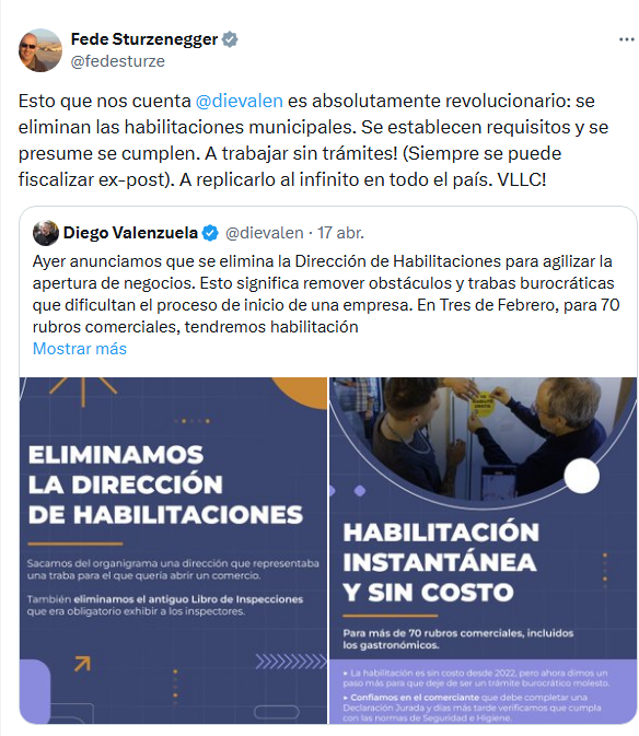 Por otro lado, Federico Sturzenegger, Ministro de Desregulación y Transformación del Estado, también celebró el «nuevo hito» de la gestión de Diego Valenzuela, intendente de Tres de Febrero, hoy reconvertido en libertario, que anunció durante la celebración del Día Mundial del Emprendedor, la eliminación de la Dirección de Habilitaciones, con el objetivo de simplificar y agilizar los trámites para abrir un comercio o una industria en su distrito. “Dimos un paso más en la dirección correcta, enchufando a Tres de Febrero en el cambio nacional. Queremos un Estado más ágil y moderno, con menos trabas, que acompañe al que quiere invertir y generar empleo”, destacó Valenzuela.