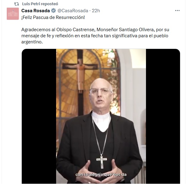 El Gobierno de Javier Milei desató una nueva controversia al designar al obispo Santiago Olivera, conocido por justificar a los represores de la dictadura, para pronunciar el mensaje oficial de Pascuas. En el mismo sentido, el «radical» Luis Petri también eligió el mismo mensaje para desear «esperanza» a sus seguidores y en especial a los mendocinos, pateando los valores democráticos cuyas banderas levantó Raúl Alfonsín y en contra la lucha por la Memoria, Verdad y Justicia.
