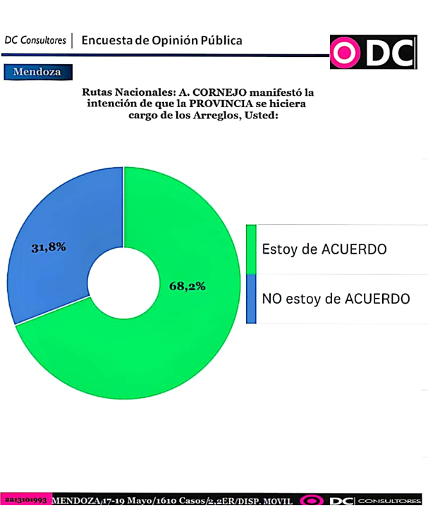 Otro dato relevante se desprende en cuanto a la decisión de Cornejo de hacerse cargo de los arreglos de las rutas nacionales dentro de la provincia. Un 68.2% de los mendocinos está de acuerdo con esa acción.