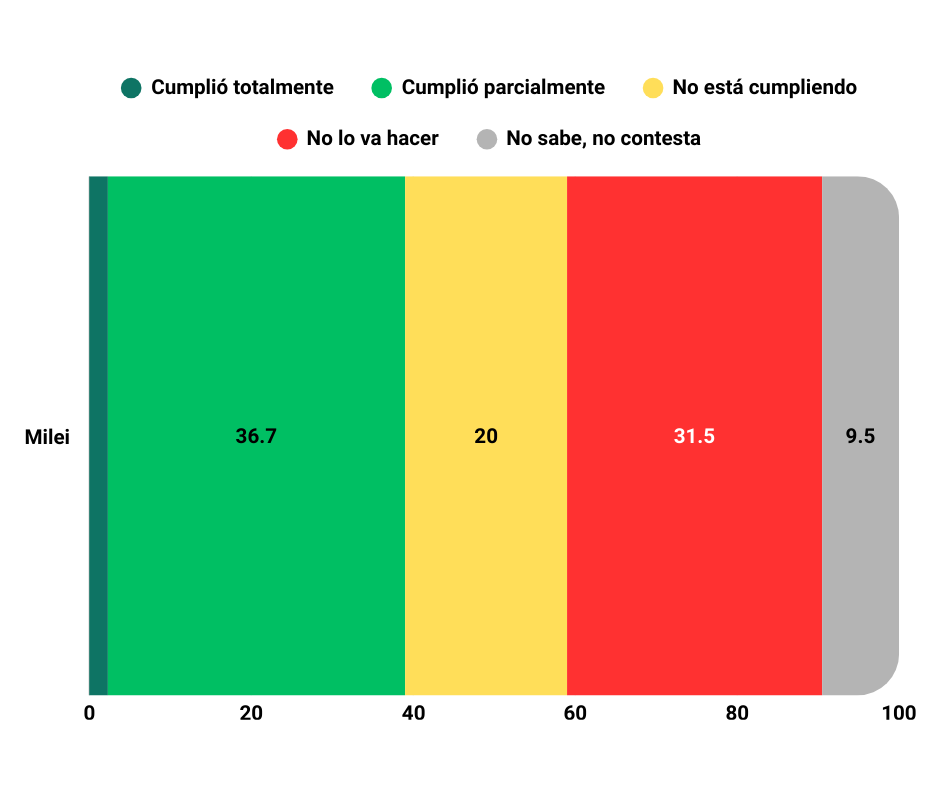En relación al cumplimiento de Javier Milei con su premisa de “enfrentar a la casta” sólo el 2.3% considera que el presidente cumplió totalmente esta precisa, aunque el número crece al 36.7% entre quienes creen que cumplió parcialmente, y le falta tiempo. En esta división el 20% considera que no está cumpliendo con lo expuesto, mientras el 31.5% considera que no solo está en falta, sino que no cumplirá la premisa.