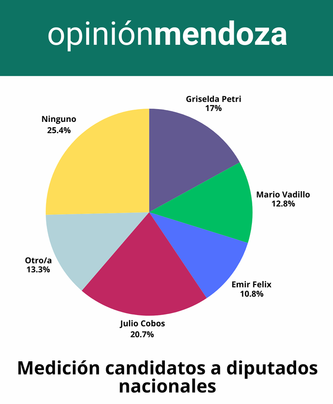 En cuanto a candidatos, la opción “ninguno” cosecha el 25,4%, Julio Cobos lidera la intención de votos con 20.7%, seguido por Griselda Petri con 17%. En tercer lugar aparece Mario Vadillo con 12.8%, Emir Felix con 10.8% y otros con 13,3%.