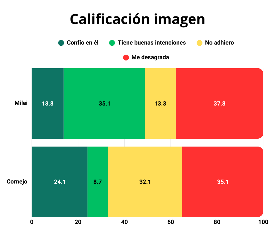 Los resultados de la muestra plantean una clara preponderancia de la LLA sobre Cambia Mendoza, tanto en la intención de votó por espacio político, como también en la imagen de su principal líder se mantiene la tendencia, con sus matices. En este segundo aspecto se aprecia una merma en la consideración general. Es de destacar que mientras Javier Milei mantiene niveles altos de apoyo y una reducción leve, el gobernador Alfredo Cornejo registra un estancamiento en el tiempo, que no parece modificarse mucho.