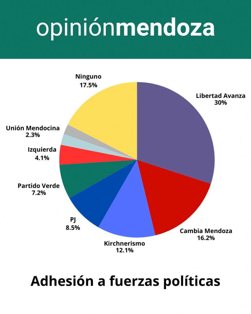 Al momento de elegir qué fuerza política lo representa: lidera la Libertad Avanza con 30%, casi duplicando a Cambia Mendoza (16,3%); este último seguido muy de cerca por las dos versiones del peronismo: k (12,2%) y tradicional (8.5%). Los que no se sienten representados por “ninguna” fuerza representan el 17.5%.