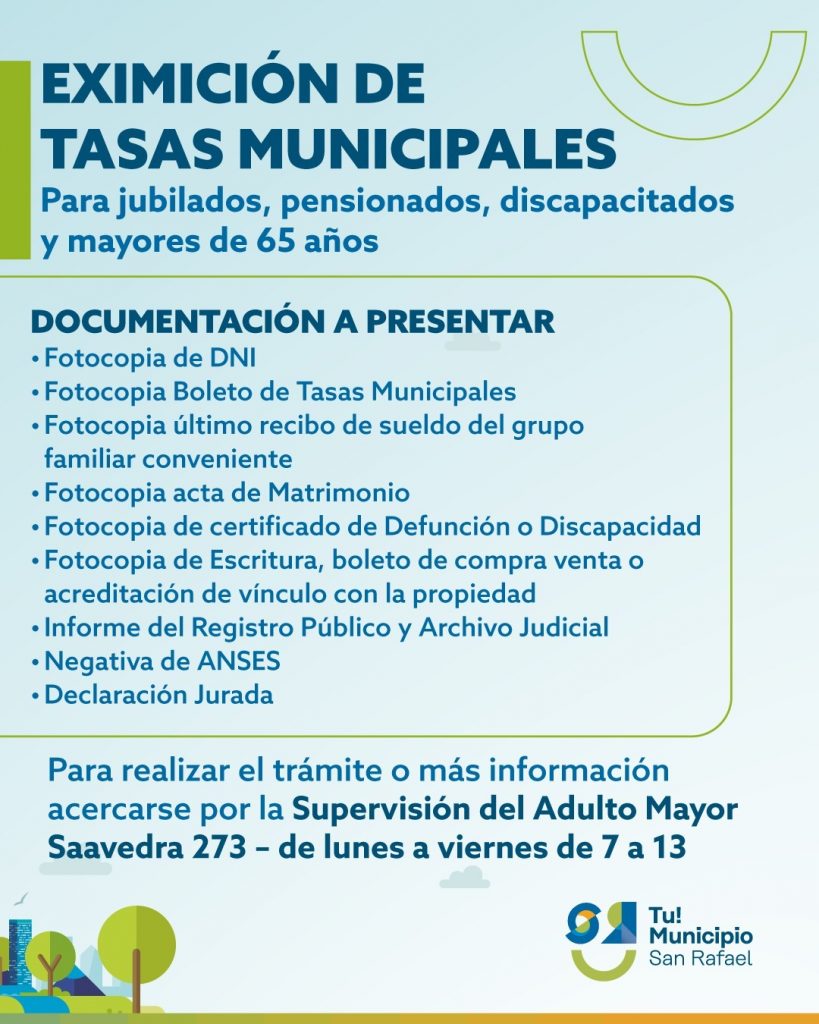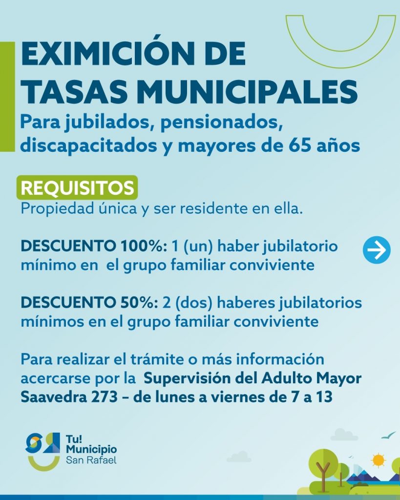 Desde hace años San Rafael acompaña a los adultos mayores con el beneficio de eximición de tasas municipales para jubilados y pensionados. En algunos casos la bonificación es total.