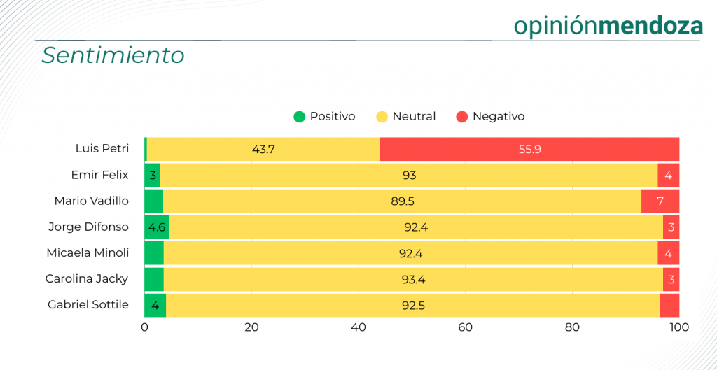 «Para el resto de los candidatos —Emir Félix, Mario Vadillo, Jorge Difonso, Micaela Blanco Minoli, Carolina Jacky y Gabriel Sottile— el escenario inicial es mucho más parejo: las menciones e interacciones presentan diferencias mínimas, y en términos de sentimiento sólo se observan matices. Difonso logra una leve ventaja en positivos, mientras que Vadillo concentra un poco más de negativos, vinculados a sus denuncias sobre problemas cotidianos», agrega Lucas Inostroza, quién también trabajó en dicho estudio.