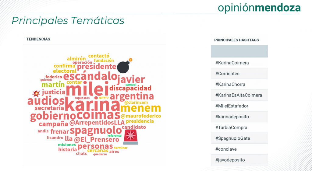 Finalmente, el informe incorpora un bonus track sobre Karina Milei, cuyo impacto digital en Mendoza se caracterizó por un predominio de menciones negativas (39,8% frente a 5,9% positivas) y hashtags instalados por la oposición como #KarinaCoimera y #KarinaChorra, con mayor alcance en los segmentos de 25 a 34 años.