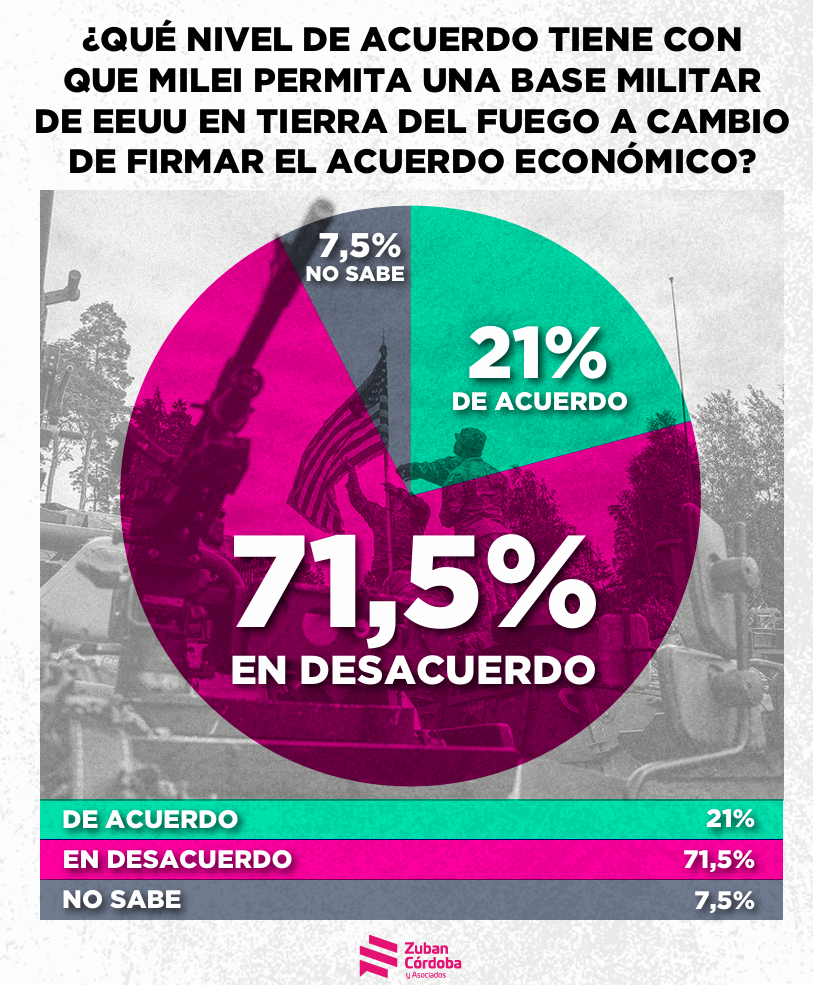 Un adelanto exclusivo para BienCuyano sobre el último estudio de opinión pública realizado por la consultora Zuban Córdoba y Asociados que se presentará el próximo domingo en su totalidad, expuso un amplio rechazo social a la posible instalación de una base militar de Estados Unidos en Tierra del Fuego, vinculada a un eventual acuerdo económico con el gobierno de Javier Milei.