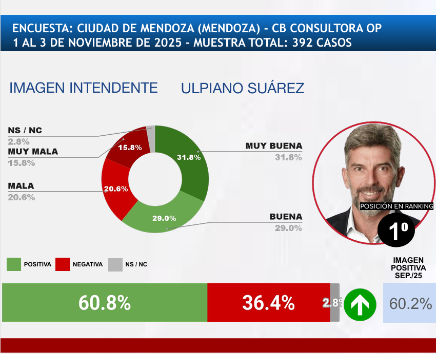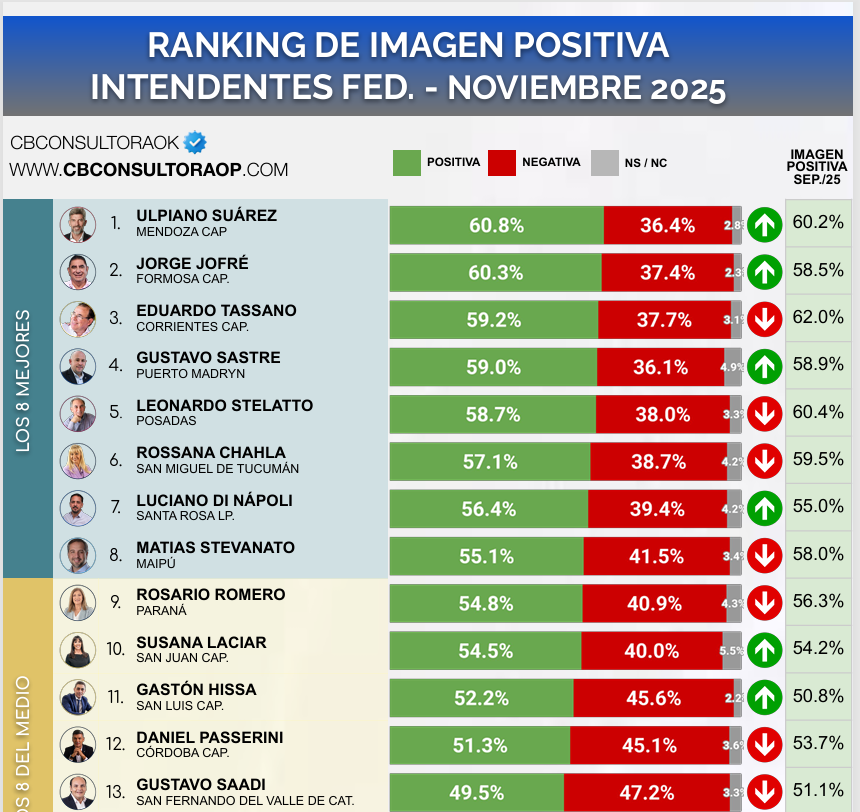 Los tres intendentes mejor valorados del mes de noviembre de 2025 por sus vecinos son: en primer lugar, Ulpiano Suárez (Mendoza Capital) con un 60,8% de imagen positiva, seguido por Jorge Jofré (Formosa Capital) con un 60,3%, y en tercer lugar Eduardo Tassano (Corrientes Capital) con un 59,2% de aprobación.