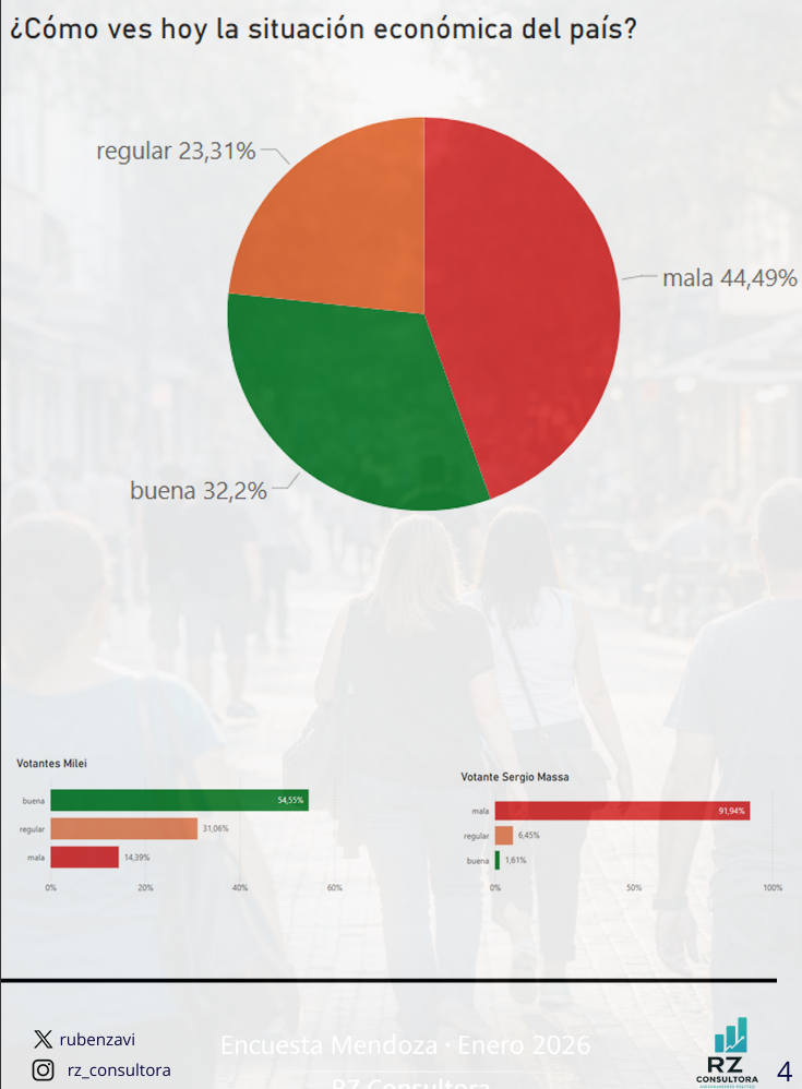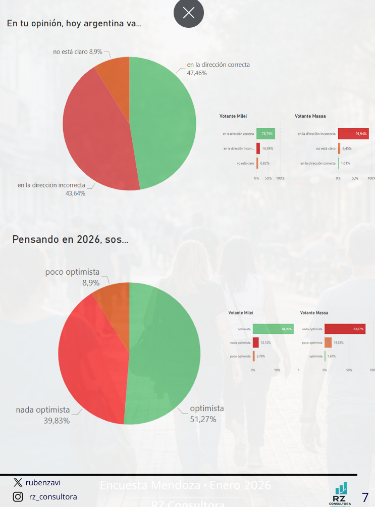 Esta última encuesta dirigida por el Lic. Rubén Zavi durante los días 29 de diciembre del 2025 al 5 de enero de 2026, sobre 1.300 casos efectivos realizadas en el Gran Mendoza, entre encuestas presenciales y CAWI (online), en formato mixto, detalla «En Mendoza, como ya ocurrió en 2023, el electorado vuelve a mostrar capacidad de diferenciar Nación y Provincia, procesando el conflicto nacional con mayor pragmatismo y menor fragmentación electoral».