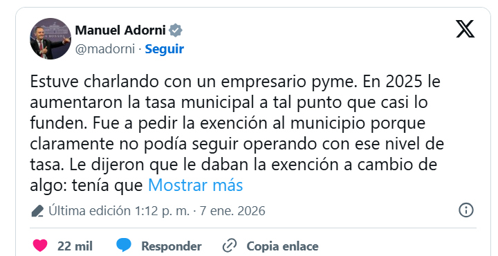 El funcionario relató en redes sociales una supuesta charla con un empresario pyme que, según afirmó, habría estado “al borde de fundirse” por un aumento de la tasa municipal en 2025. De acuerdo a su versión, al pedir una exención, el municipio – que evitó mencionar- se la habría ofrecido a cambio de firmar una nota culpando al presidente Javier Milei por su situación económica.