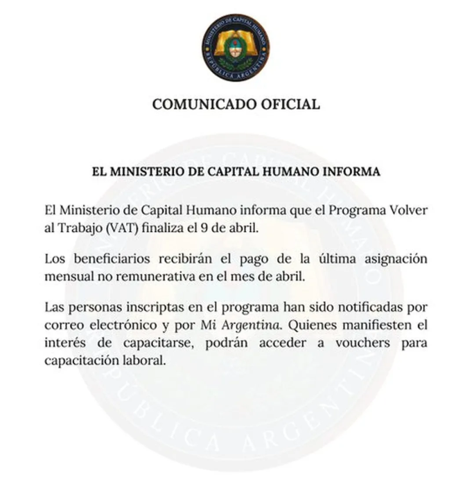El 9 de abril de 2026 finalizó el programa Volver al Trabajo (ex Potenciar). Lo anunció el ministerio de Capital Humano: no se renovarán las asignaciones, que serán reemplazadas por vouchers para capacitación.