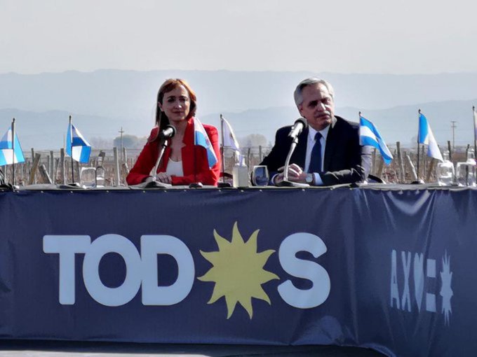 Fernández llegó al aeropuerto de Mendoza acompañado por los gobernadores de Entre Ríos, Gustavo Bordet; de San Juan, Sergio Uñac; y de Tierra del Fuego, Rosana Bertone, entre otros, y fue recibido allí por la senadora nacional y candidata a gobernadora de Mendoza, Anabel Fernández Sagasti.