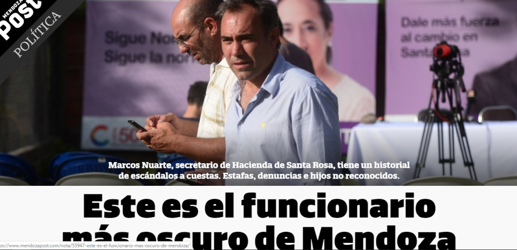 Hagamos un poco de memoria y vamos a descubrir algunos personajes conocidos. En septiembre del 2019, en pleno gobierno de Alfredo Cornejo, El Tribunal de Gestión Asociada, a cargo de la Jueza Alicia Boromei, condenó al medio digital Mendoza Post, a los periodistas Ricardo Montacuto y Cristian Sanz, de Plataforma Digital S.A., a pagar la suma de 600 mil pesos en concepto de daños por una demanda que le inició el secretario de Gobierno de Santa Rosa, Marcos Nuarte. La justicia consideró que el medio periodístico había hecho «denuncias falsas».