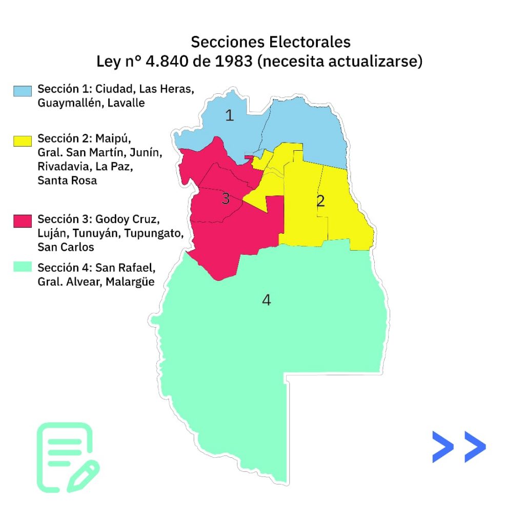 Cabe señalar que la Ley Provincial Electoral, fue establecida por la Ley n° 4.840 de 1983, que determina la creación de distritos electorales para la elección de diputados y senadores de forma proporcional. Actualmente, la ley establece 4 (cuatro) distritos electorales: Primero (Ciudad, Las Heras, Guaymallén, Lavalle); Segundo (Maipú, Gral. San Martín, Junín, Rivadavia, La Paz, Santa Rosa); Tercero (Godoy Cruz, Luján, Tunuyán, Tupungato, San Carlos); Cuarto (San Rafael, Gral. Alvear, Malargüe). Esta composición electoral fue establecida al finalizar el gobierno “de facto” en Mendoza. Por su parte, la coautora, Senadora Andrea Blandini, señaló “cuando se habla de democracia representativa también, debe ser en acción y eso es lo que busca la modificación del artículo 95 de la Ley 2551. Hay departamentos de Mendoza que no han tenido voces en las Cámaras.