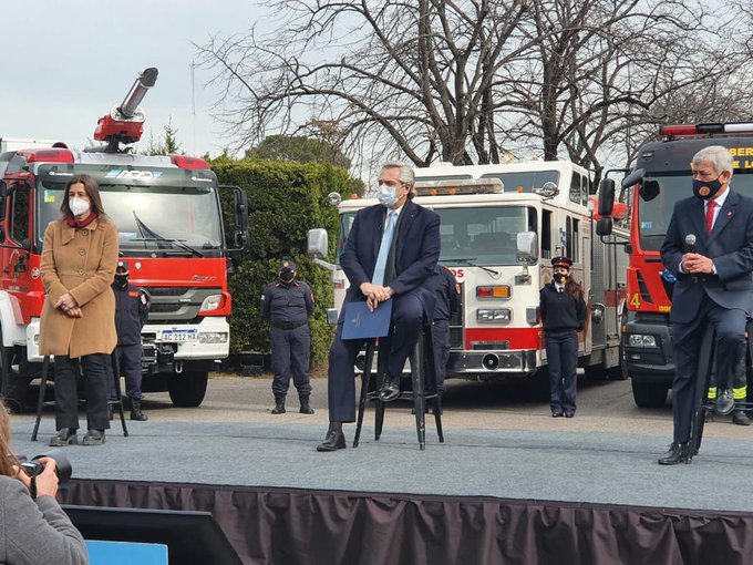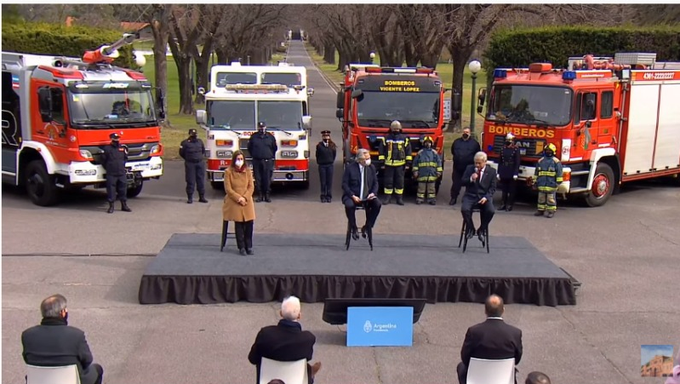 Por su parte, la ministra Sabina Frederic detalló que durante el año 2021 se destinará “la asistencia con un fondo de más de 3 mil millones de pesos para todo el sistema de bomberos”.