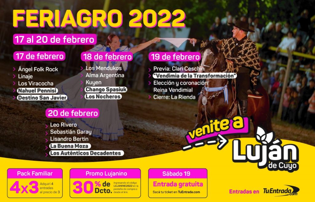 Por su parte, las actividades en el Multiespacio Cultural Luján de Cuyo se desarrollarán del jueves 17 al domingo 20 de febrero y, como indica la tradición del departamento, las jornadas estarán caracterizadas por los representativos espectáculos de caballos criollos (todos los días de 9 a 18hs), los habituales patios de comidas, exposiciones agrícolas junto a los stands de emprendedores y artesanos, juegos para toda la familia y la participación de prestigiosos artistas locales y nacionales. Asimismo, la grilla artística quedó conformada de la siguiente manera:
