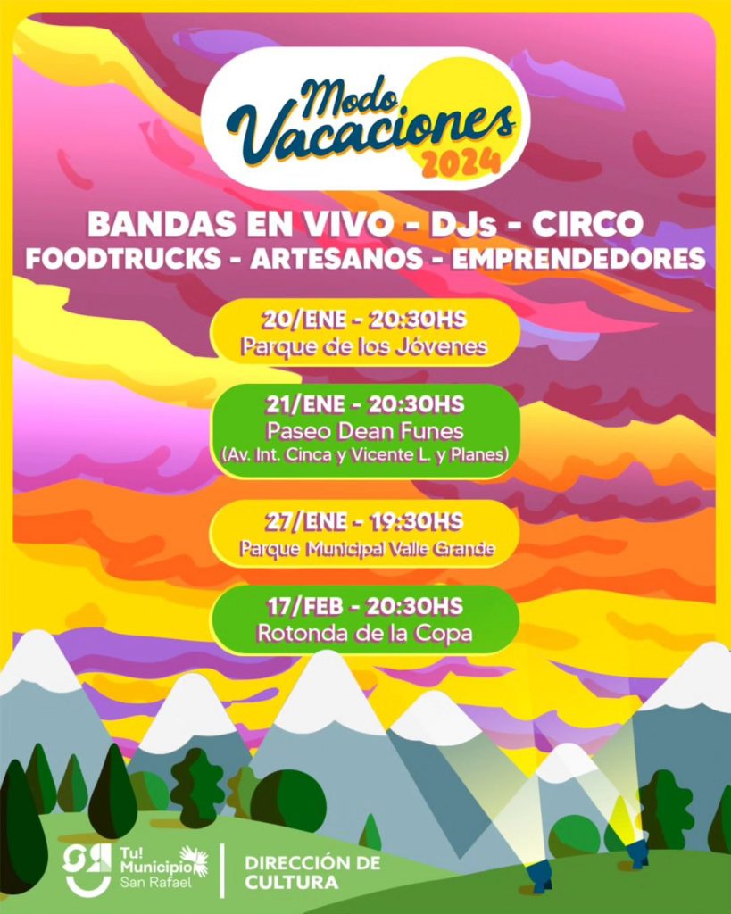 Durante enero y febrero se realizará una nueva edición de “Modo Vacaciones”, propuesta itinerante impulsada por la Municipalidad de San Rafael con múltiples actividades y entrada libre y gratuita.