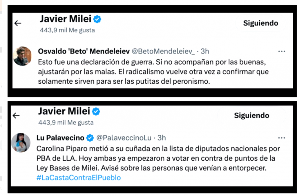 Si bien Milei ha borrado algunas de sus reacciones, aún se conservan algunos de los pantallazos. Entre ellos, el ‘me gusta’ a un tuit que calificaba al radicalismo como «las putitas de peronismo» y otro de Lu Palavecino, diputada nacional de La Libertad Avanza, en el que Milei apoya los ataques a Carolina Píparo, su excandidata a gobernadora por la Provincia de Buenos Aires.