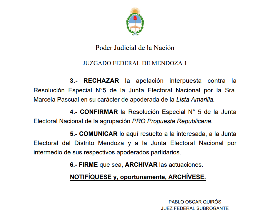 En una resolución determinante, el Juzgado Federal con competencia electoral ha desestimado el recurso de apelación presentado por los representantes de la Lista Amarilla, encabezada por Hebe Casado, contra la Resolución Especial Nº 5/2024 emitida por la Junta Nacional Electoral del PRO. Esta medida, tomada por el juez, valida la determinación previa de la Junta Nacional Electoral (JNE) que anuló las resoluciones y actas impugnadas por la Lista Propuesta Federal, liderada por Gabriel Pradines.