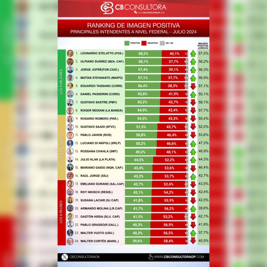 Como todos los meses, CB Consultores elabora el ranking de intendentes de todo el país, en el que mide las imágenes positivas y negativas de cada uno, en base a la percepción de los habitantes de sus provincias.
