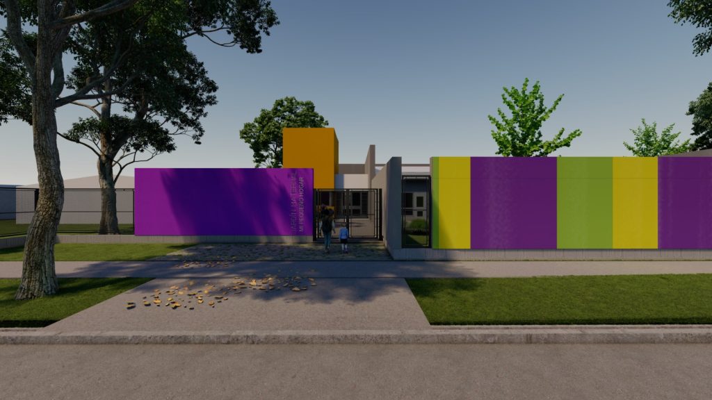 Para el cerramiento del predio, se ha pensado en la combinación de un cierre transparente (malla electro soldada) y otro ciego realizado con estructura de hormigón y mampostería. Estos cierres ciegos, que se usarán en el patio principal del jardín maternal, serán intervenidos con murales.