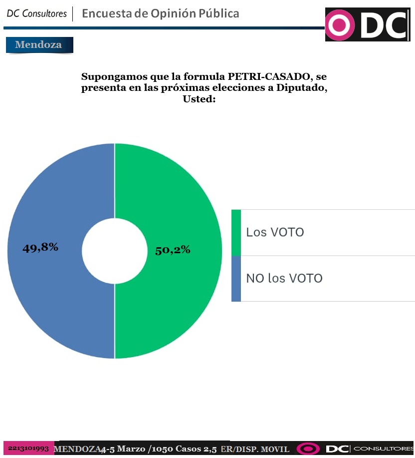 Y los números acompañan. La reciente encuesta realizada por DC Consultores de Anibal Urios en la provincia de Mendoza preguntó puntualmente cómo vería la fórmula electoral Luis Petri – Habe Casado, lo cual logró tener una gran aceptación por parte de los mendocinos, con una base nada despreciable de un 50 por ciento y un techo aún indefinido, con mucho potencial, que incluye la confirmación oficial de la fórmula, mucho trabajo de campaña, y estrecho contacto territorial con la gente.