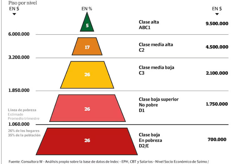 Un reciente informe, basado en datos del Indec, muestra cómo se distribuyen los ingresos familiares y qué nivel de ingresos se necesita para pertenecer a cada clase social en la Argentina. Apenas el 5% de la población argentina pertenece a la clase alta, es decir, para estar dentro de este grupo exclusivo, un hogar debe contar con ingresos mensuales de al menos $6 millones. Menos de la mitad de la población es de clase media.