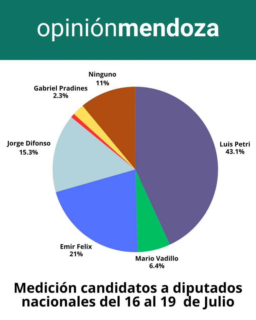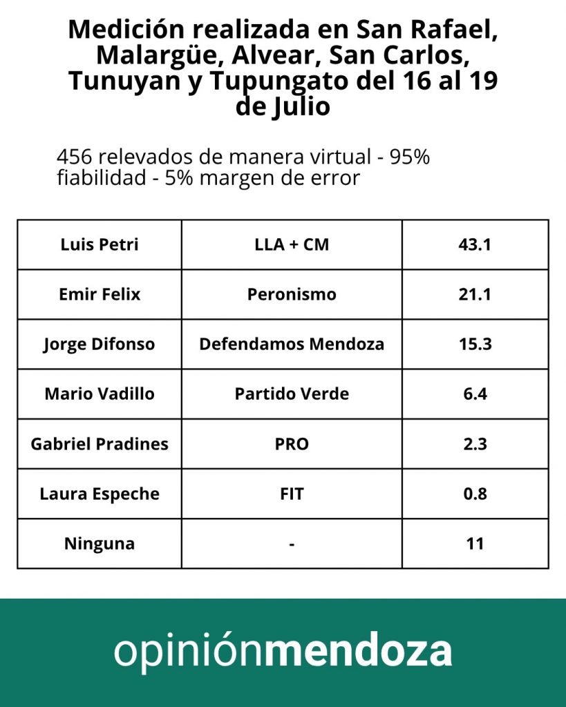 En tanto agrega «Los resultados de la muestra plantean una clara preponderancia de la LLA sobre Cambia Mendoza, tanto en la intención de votó como por espacio político, como también en la imagen de su principal líder se mantiene la tendencia, con sus matices. Finalmente, en lo referido a los hipotéticos candidatos la posible candidatura de Luis Petri (como síntesis de unión entre La Libertad Avanza y Cambia Mendoza) supera ampliamente a Emir Felix, medido como candidato único por el peronismo. Petri logra seducir a un espectro más amplio del electorado que el que opta por LLA como espacio político. Félix por su parte no suma mas haya del segmento que opta por el peronismo tradicional, en una regional con fuerte presencia de intendentes peronistas. El tercer lugar de Jorge Difonso se asienta fundamentalmente en el Valle de Uco, con registros promediando su performance en San Rafael y Alvear, cayendo a la marginalidad en Malargüe. En tanto, Mario Vadillo tiene registros desiguales al gran Mendoza, e incluso en la región medida existe un diferencial entre las zonas más urbanas y las rurales».