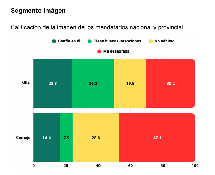 «Sobre la imagen y apoyo al presidente Javier Milei se mantiene en niveles altos. con un diferencial importante entre quienes tienen una imagen positiva firme y quienes lo hacen con algunas precauciones. Esta tendencia es similar en todos los segmentos etarios, pero más marcada entre los jóvenes y mujeres. En relación a la imagen del gobernador Alfredo Cornejo es notoriamente menor que la del Milei. Aunque registra un bloque mayor entre los que lo valoran en forma positiva firmemente y quienes lo hacen con reparos» sostienen los directores de Opinión Mendoza en base a su trabajo de campo.