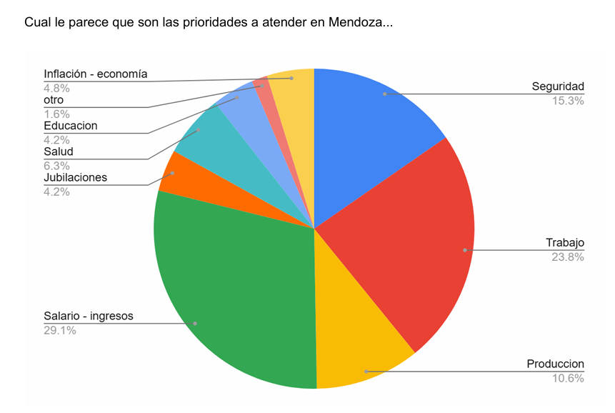 En relación a temas de importancia para los mendocinos del sur y el Valle de Uco surge que las prioridades «a atender» son Salario-Ingresos (29%),