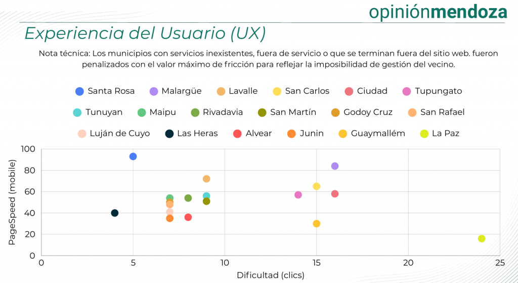 Hallazgos por Dimensión UX y Eficiencia: Santa Rosa y Malargüe lideran la velocidad de carga. Esto es clave: un vecino en zonas con conectividad reducida necesita webs livianas. En contraste, municipios con alta carga de visitas como Guaymallén presentan dificultades técnicas que podrían estar frustrando miles de trámites mensuales.